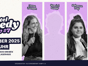 Die neue Comedy-Reihe geht in die siebte Runde. Mit dabei sind diesmal: Jana Jansen – frisch aus Berlin, direkt, ehrlich und mit einem Humor, der garantiert keinen Umweg nimmt. Rebecca Pap – sie war schon einmal bei uns, hat das Publikum komplett überzeugt – und kommt als erste Künstlerin überhaupt zum zweiten Mal zu Viertel Comedy zurück. Special Guest – der Name bleibt noch geheim, aber wir können versprechen: Diese Überraschung wird euch umhauen. Durch den Abend führt wie gewohnt Hinnerk Köhn – Moderator, Comedian, Stimmungsgarant und Meister darin, zwischen rotem Faden und Fassungsverlust zu balancieren. Einlass: 19.30 Uhr